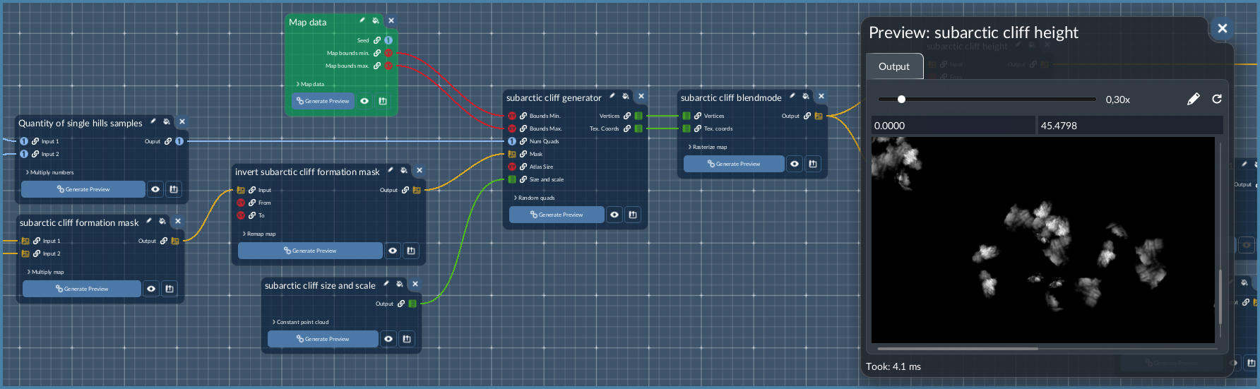 Thanks to the visual representation of the generator’s logic, including phases and data flow, it’s easier to understand how everything fits together and how it can be tweaked to the individual liking. It is even possible to dry-run parts of the generator separately to preview intermediate results. If you want to see the set-up in action, the whole generation can be tested in the map editor, as the Terrain Generator Editor is directly embedded. No need to restart the game after making changes. This way, ideas can be quickly tried out and refined until the world looks exactly how you want it to feel and play.