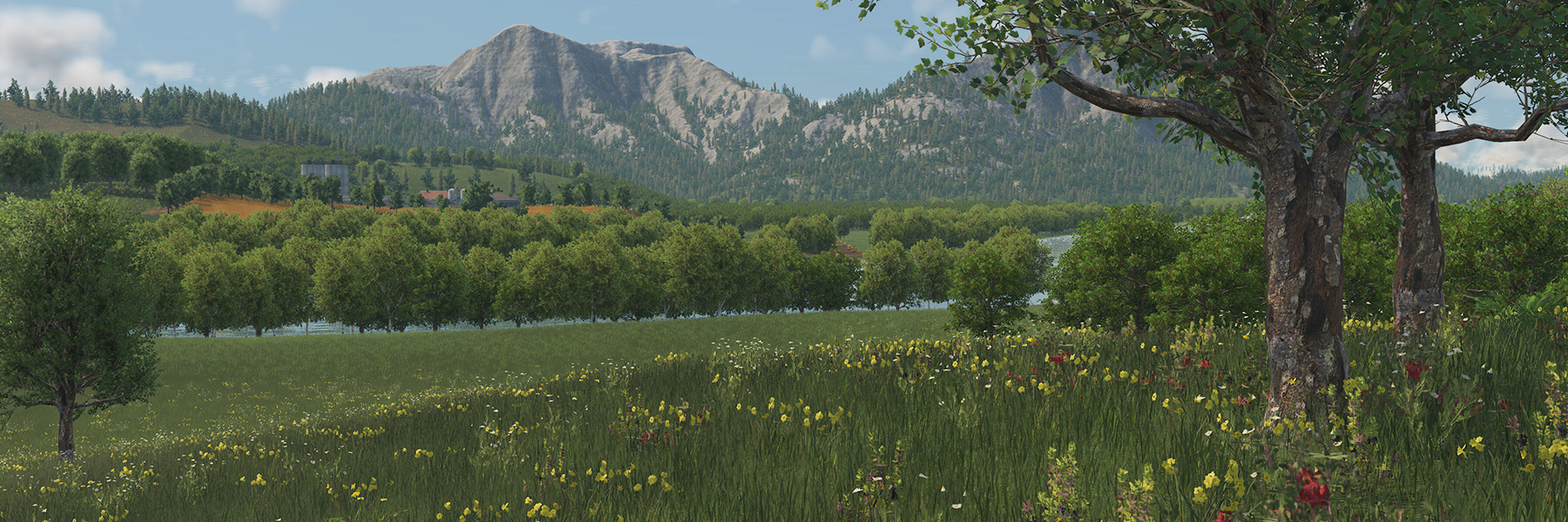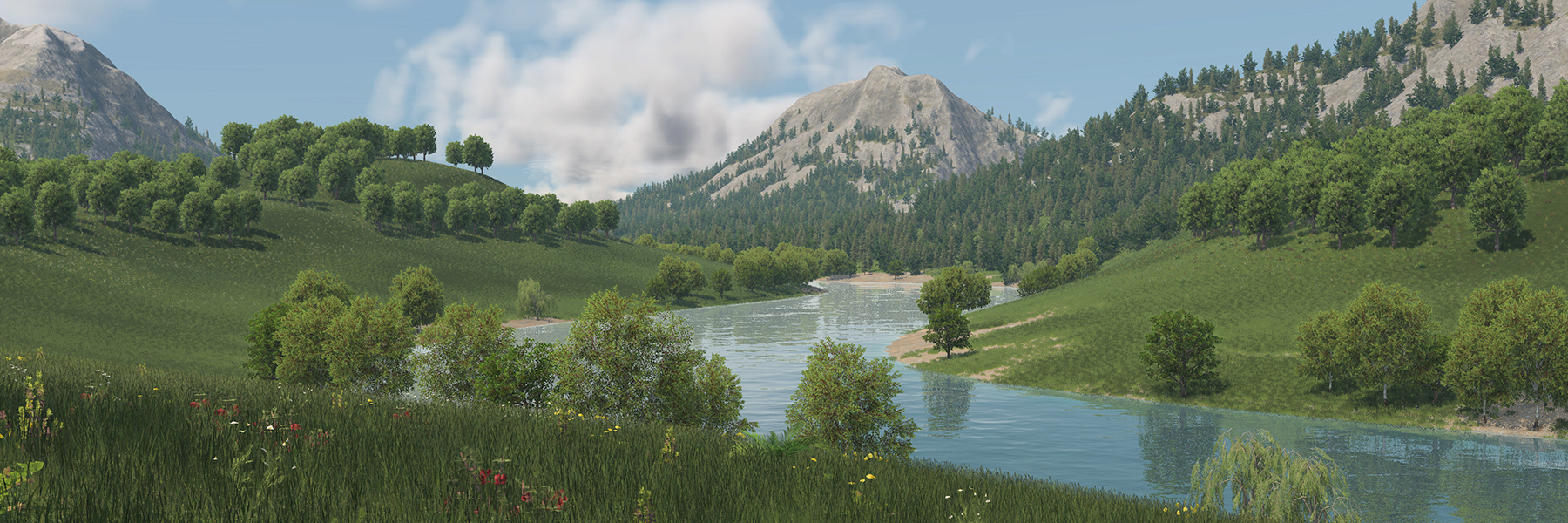 It’s not just the terrain that’s more flexible – terrain materials are too. In addition to the grass textures familiar from Transport Fever 2, terrain materials can feature individual plants, stones, and other small objects which will automatically appear wherever that material is used: ferns in the forest, wildflowers in meadows, scree on rocky slopes. This breaks up monotony and gives the landscapes their individual flair.