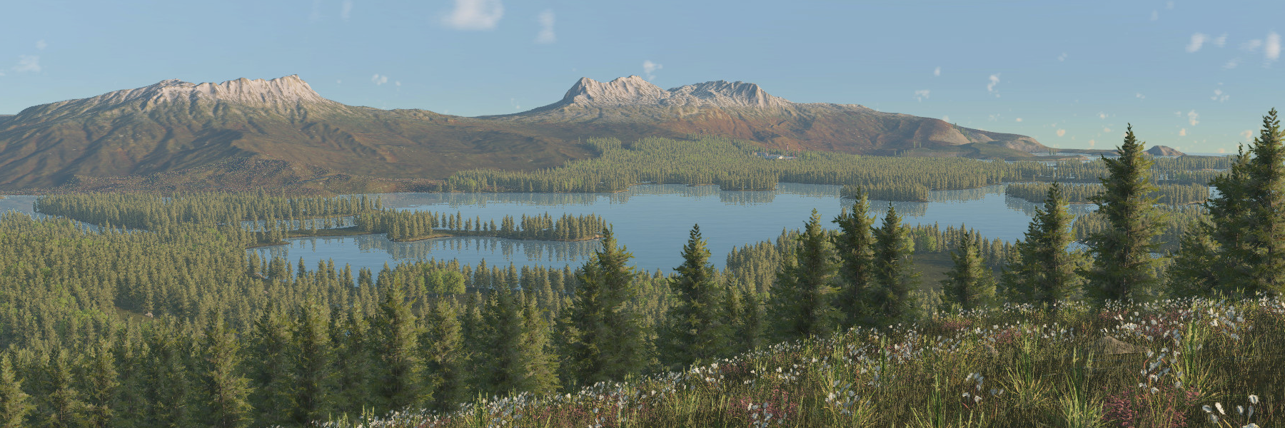 The Temperate Climate offers numerous aspects of these regions: large mountain ranges, green meadows, dense mixed forests, hilly terrain, and inland lakes. During map generation, players can adjust the weighting between the individual landscape features. By combining these biomes, entirely new landscapes can now be created. When planning transport chains, one must ask oneself questions such as whether the cargo should be transported by ship across the lake or whether the train should transport it all around. Building railway lines may be easy in flat areas, but it becomes difficult in the mountains or along steep coastlines. Should the railway line follow the course of the river or take a shortcut through the mountain using a tunnel? Finding the right route can thus become a tricky undertaking. Or maybe it’s just a good excuse to use a helicopter after all.